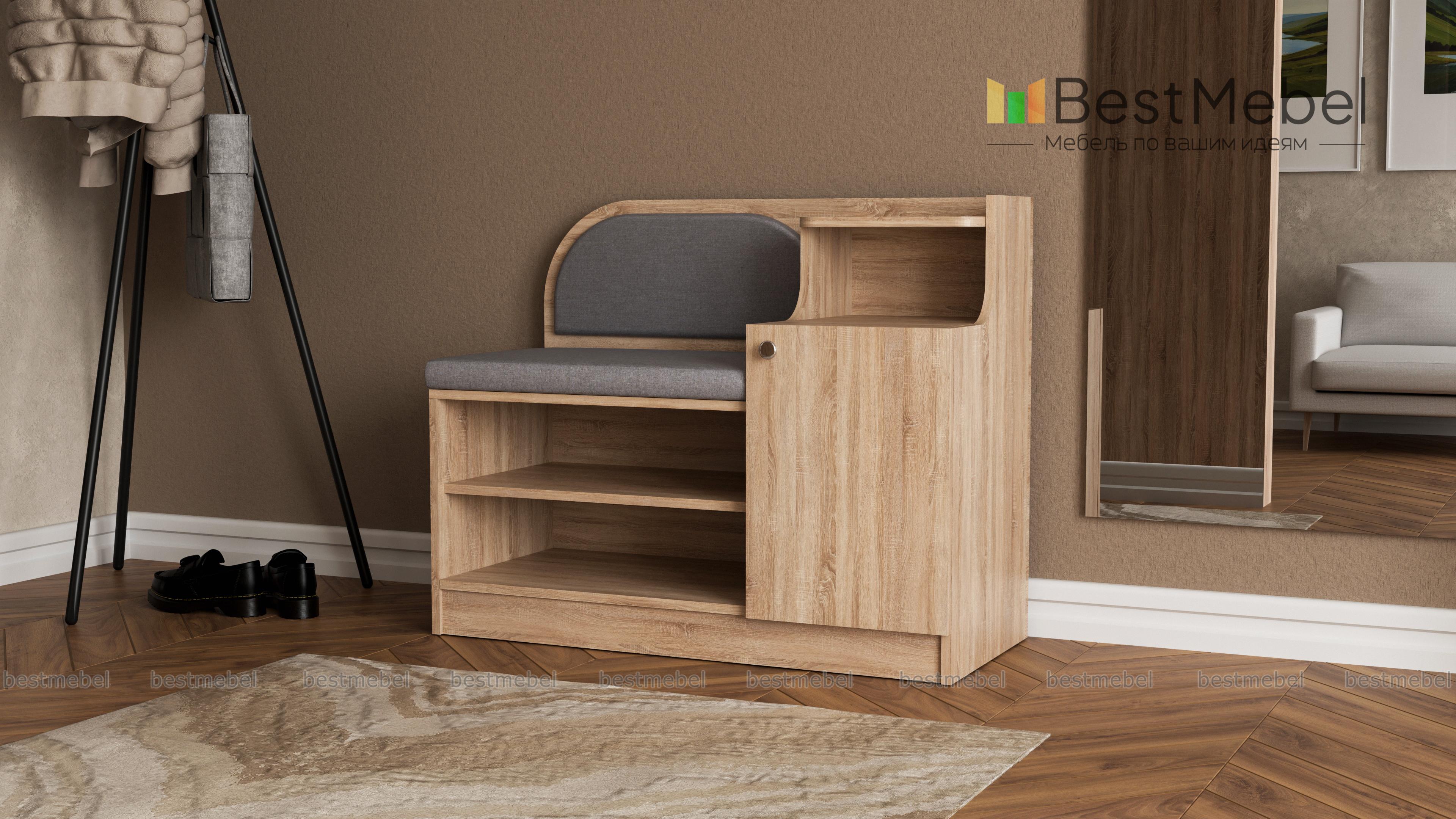 Обувница Меренга BMS поможет вам не только бережно разместить обувь, уходовые средства и бытовые мелочи, но и с комфортом обуться. Многофункциональная модель оборудована открытыми обувными полками, распашным отделением, нишей и сиденьем с высокой скругленной спинкой. Обувница выполнена в практичных темных тонах, на сиденье располагаются мягкие накладки в износостойкой ткани. Купить обувницу Меренга BMS и дополнить интерьер входной зоны практичным предметом вам поможет наш интернет-магазин.