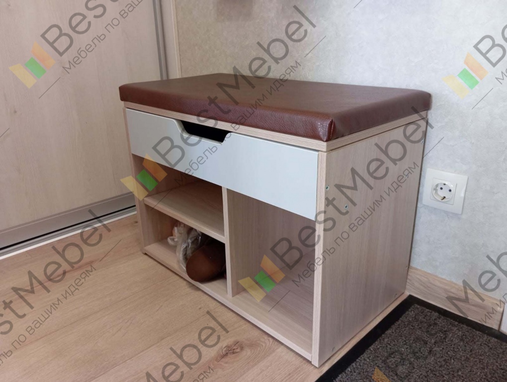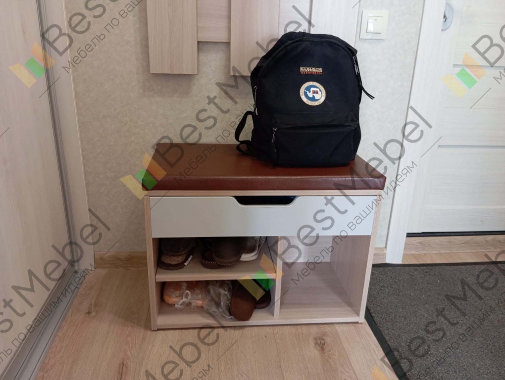 Заказ №891627 от 05.10.2023. Обувницу заказала небольшую, с нужными мне размерами в маленькую прихожую. Несмотря на компактность обувница многофункциональная. Есть и полки для обуви разной высоты, и сидение, и закрытый ящик для мелочей. Цвет Ясень Шимо Светлый/ фасад Серый/ сидение Коричневый. Покупкой довольна, рекомендую. 00000522965 Обувница Томас 1 BMS (650х500х350)