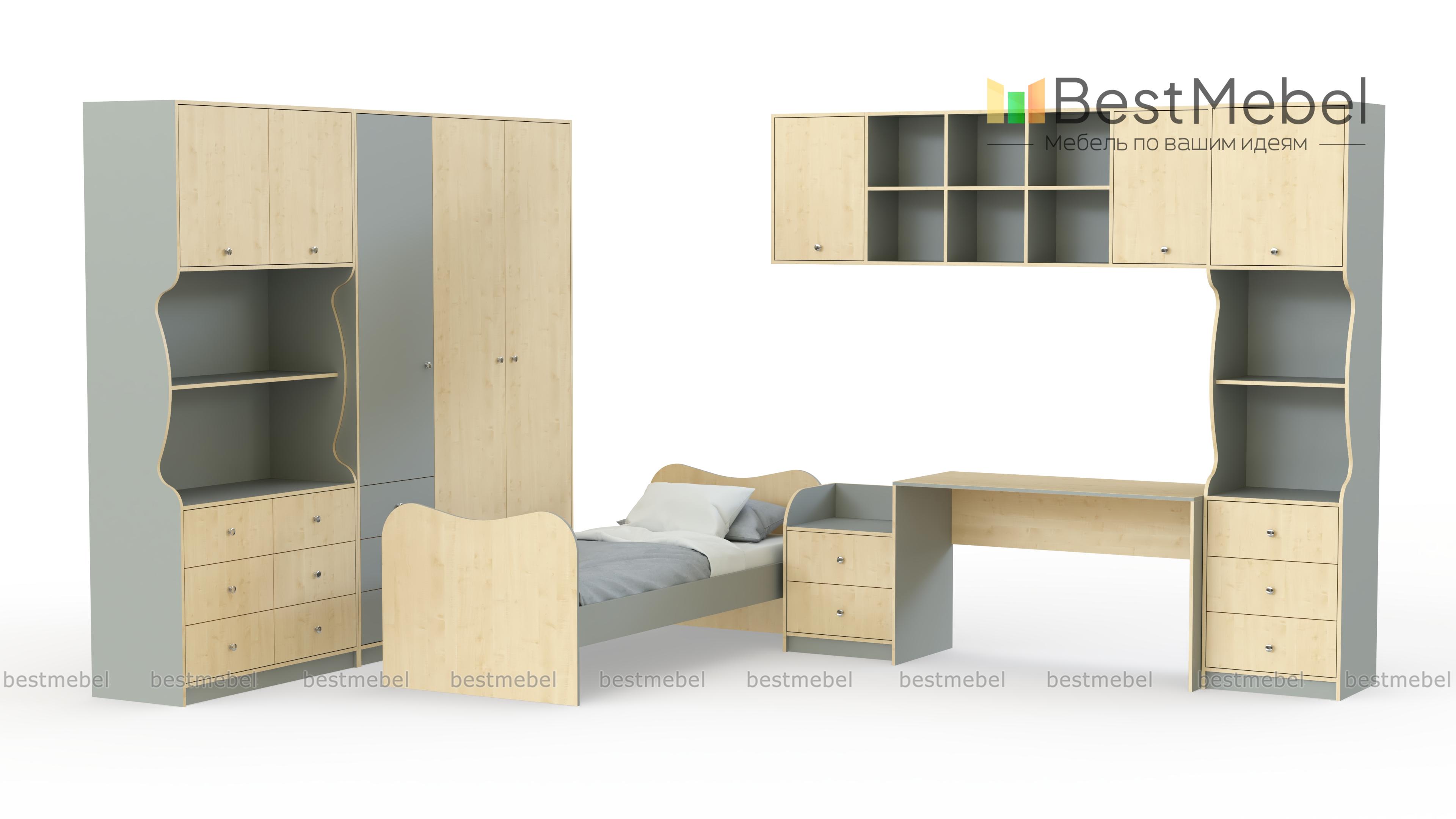 Детская модульная система Кирилл-2.2 BMS поможет полностью обустроить уютную комнату в современном стиле. Композиция из отдельных элементов максимально органично впишется в интерьер, выгодно используя особенности планировки. В комплект входят платяной распашной шкаф, комбинированные книжные шкафы, письменный стол, навесная полка, кровать с фигурно вырезанными спинками и прикроватная тумба. Купить детскую модульную систему Кирилл-2.2 BMS, подобрав расцветку для комнаты мальчика или девочки, вы сможете в нашем интернет-магазине.