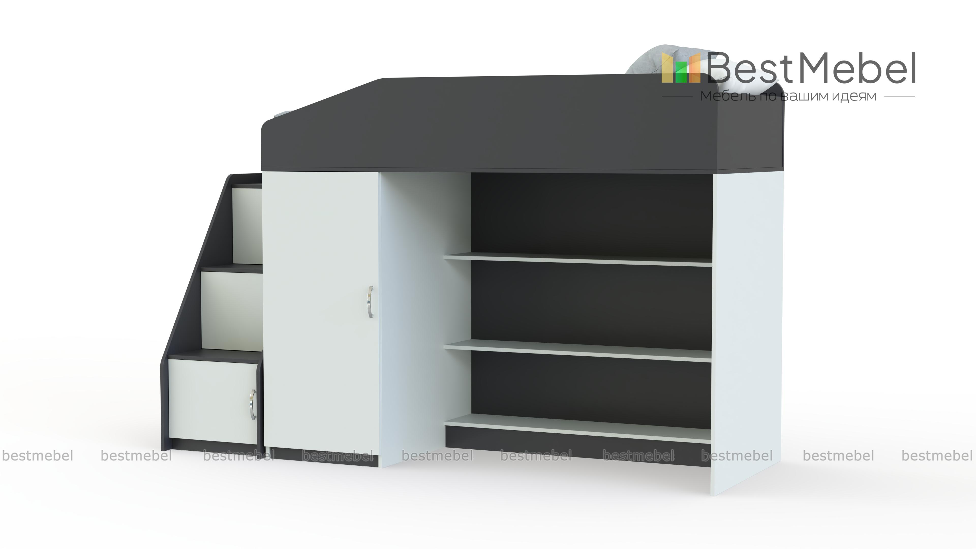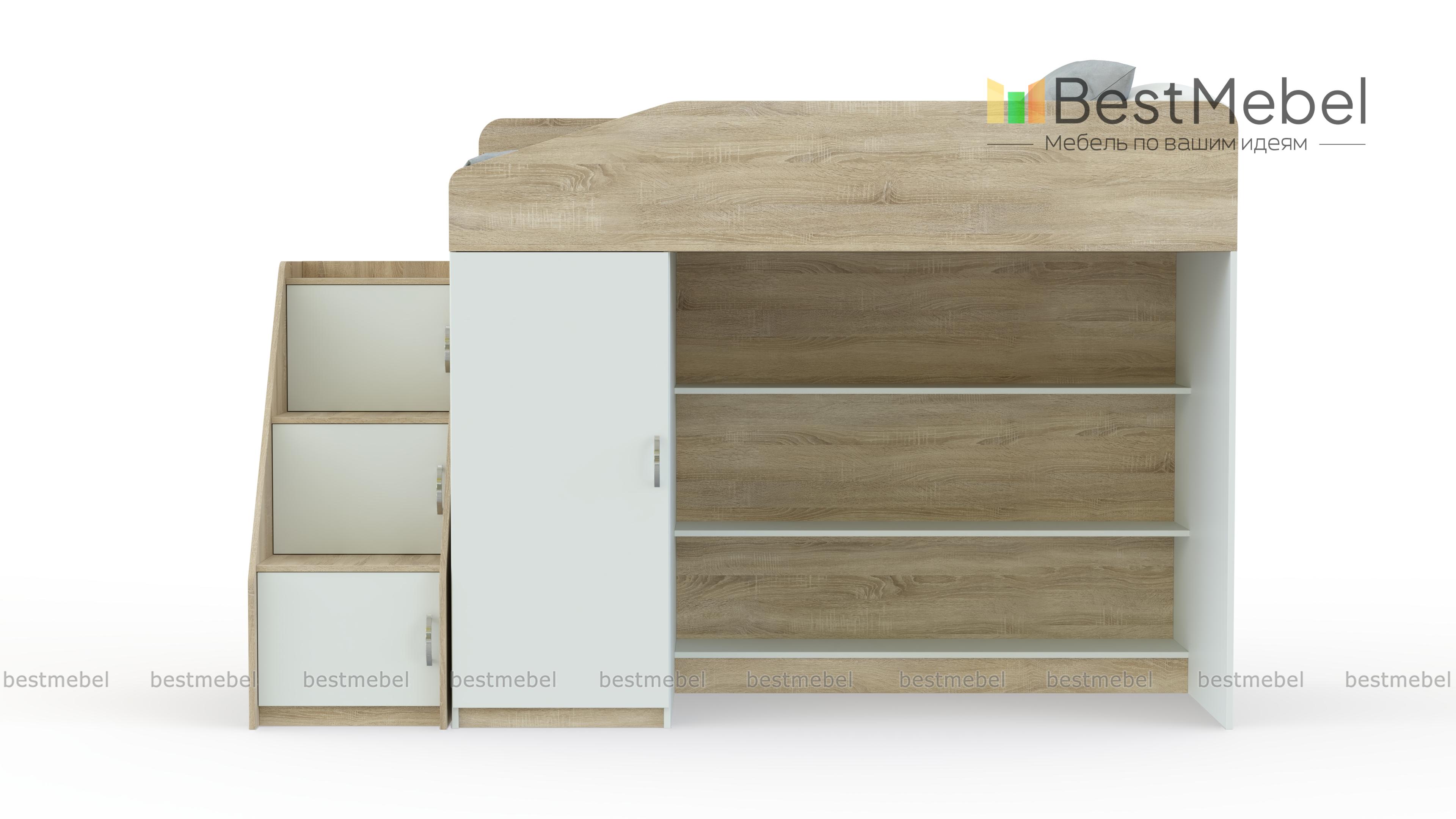 Кровать-чердак Миф-11 BMS отличается комбинированной конструкцией, незаменимой в современной малогабаритной детской. Яркая модель оборудована расположенной на втором ярусе кроватью с защитными бортиками и расположенными на первом распашным шкафом для одежды и просторными полками. Завершает композицию приставная лестница-горка с вместительными ящиками под ступеньками. Скругленные углы обеспечат безопасность пользования, а сочетание древесных тонов и белых элементов создаст позитивную атмосферу. Купить кровать-чердак Миф-11 BMS приглашаем в наш интернет-магазин.