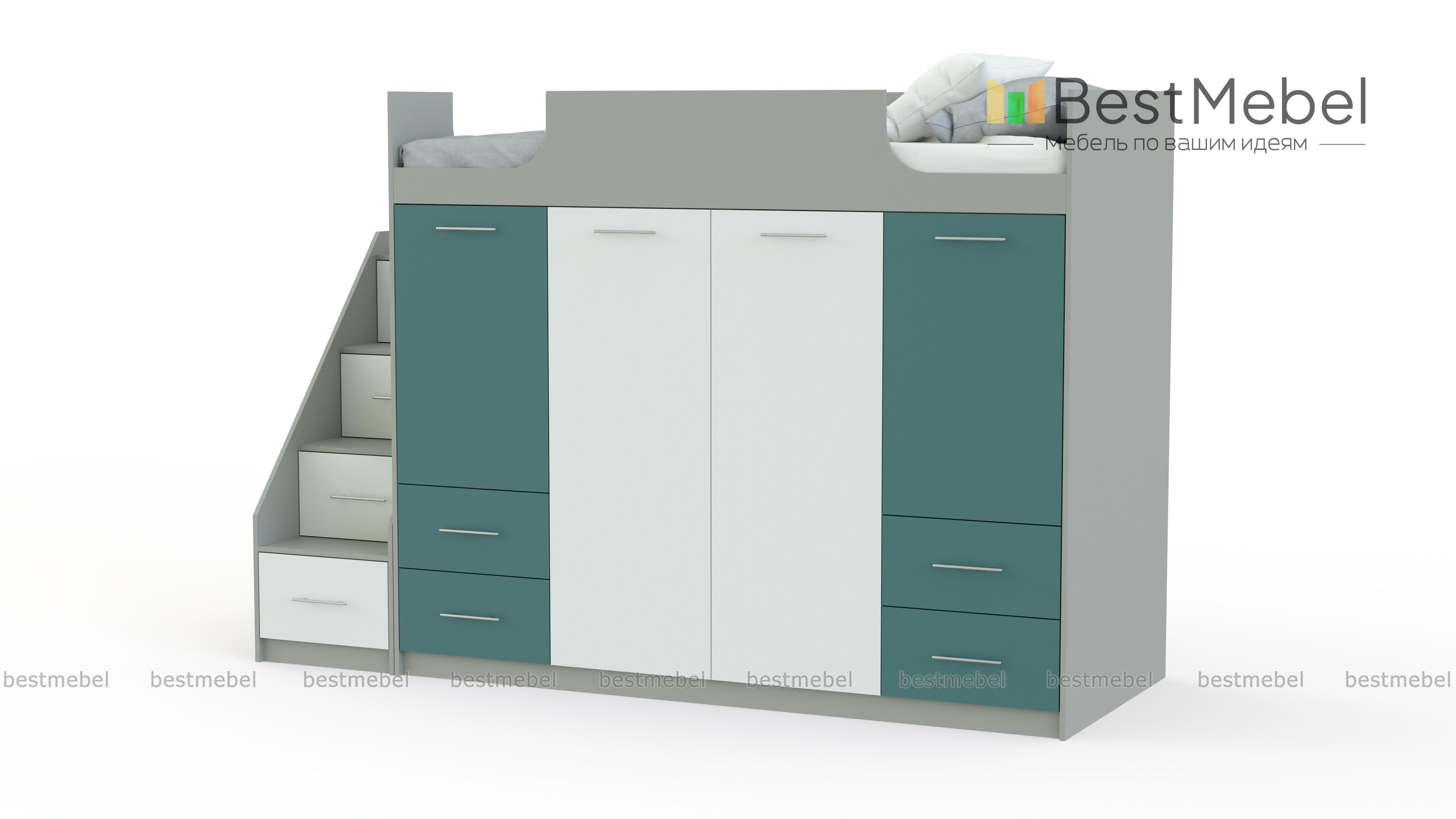 Кровать-чердак Симо 2 BMS – это не только комфортное спальное место, но и продуманная система хранения, которая поможет легко поддерживать в детской порядок. Расположенная на втором ярусе кровать оборудована защитным бортиком и дополнена лестницей-комодом с вместительными ящиками под ступеньками, а первый ярус занимают распашные отделения с полками и штангами и выдвижные ящики для игрушек или постельного белья. Купить кровать-чердак Симо 2 BMS приглашаем в наш интернет-магазин, подобрав цветовое решение.