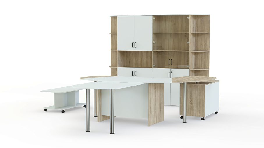 В комплект входит 2 шкафа, 2 угловые приставки, письменный стол, 2 приставных стола и журнальный столик. В кабинете будет комфортно работать, проводить небольшие совещание и принимать посетителей. Заказать комплект можно в двух цветах.