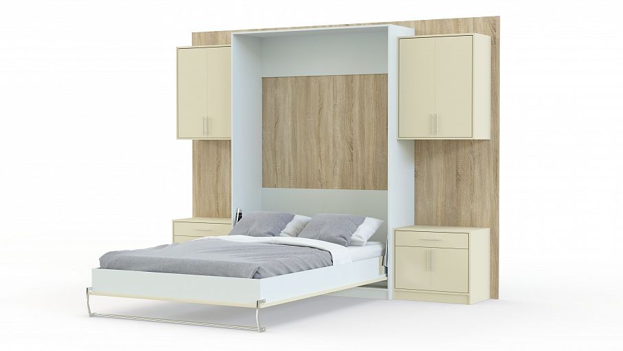 Шкаф-кровать трансформер Лайт BMS отличается эффектным минималистичным дизайном. Прямой комплекс, оборудованный встроенной кроватью с вертикальным механизмом подъема, значительно сэкономит полезную площадь комнаты. По бокам от имитации трехдверного шкафа располагаются навесные элементы – тумбы с выдвижными ящиками и распашные секции. Выполненная в бежево-белой гамме, модель дополнена хромированной фурнитурой. Купить шкаф-кровать трансформер Лайт BMS с учетом оптимальных параметров приглашаем в наш интернет-магазин.