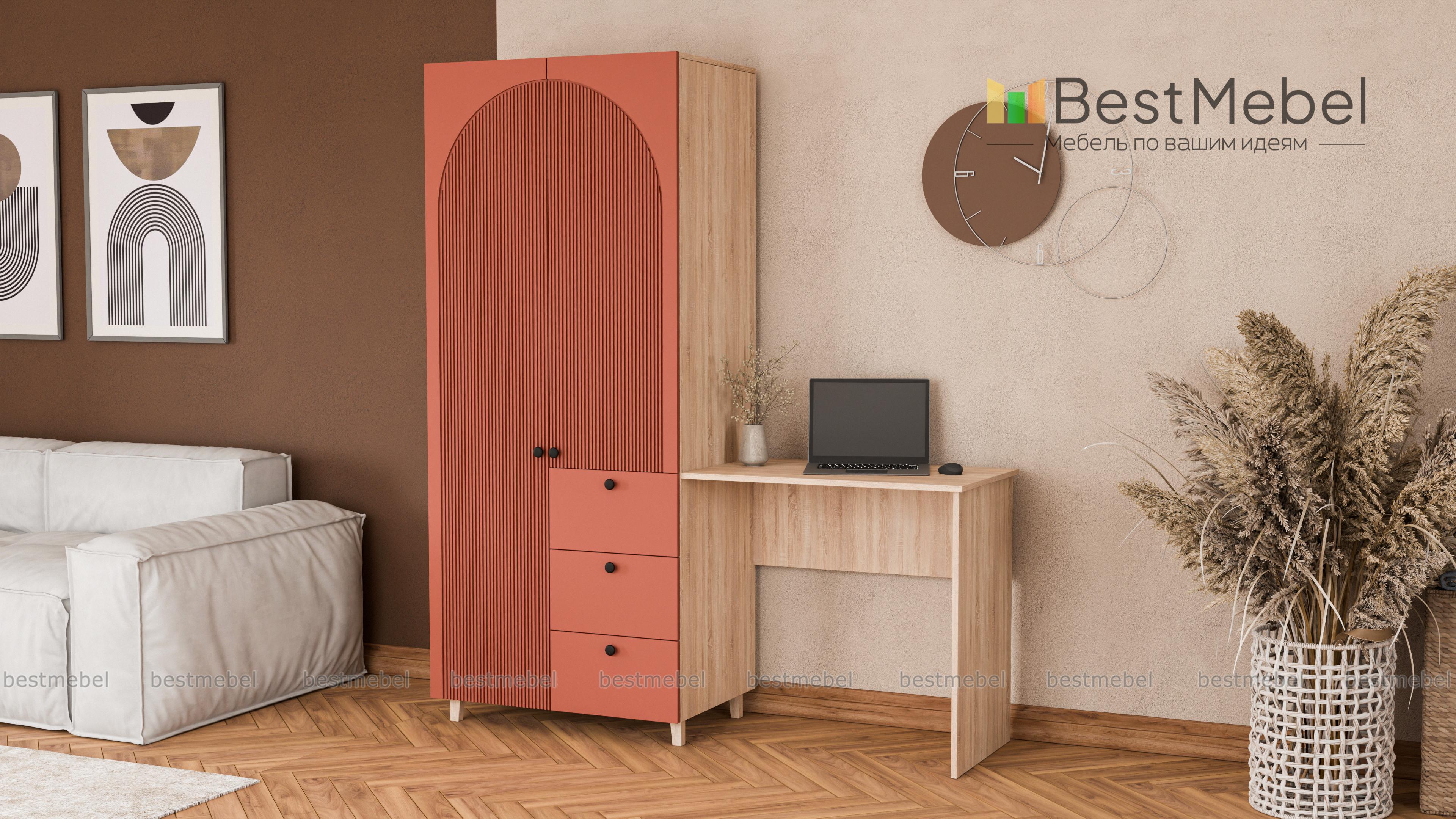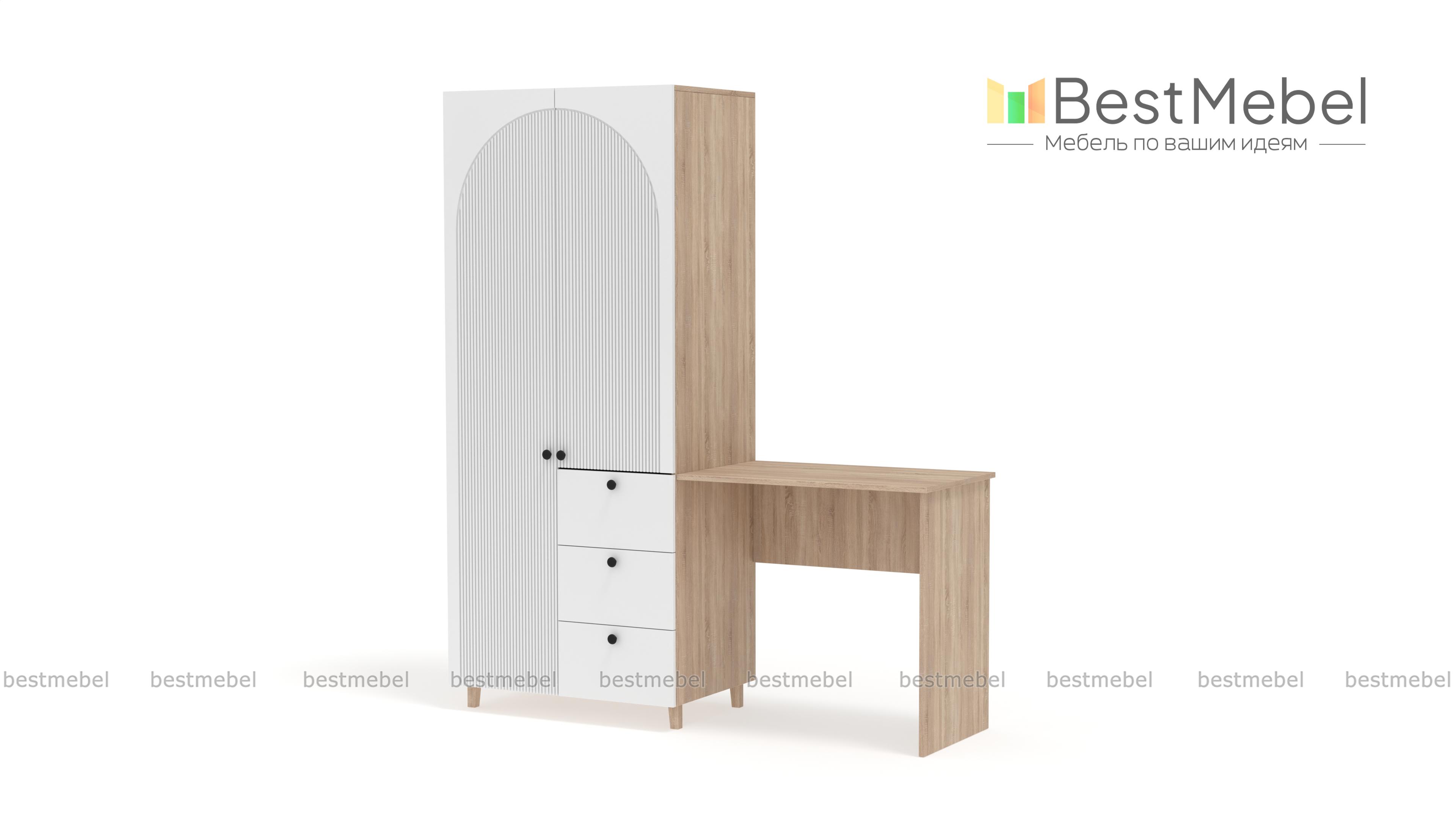 Шкаф со столом Вивьен 4 BMS значительно экономит пространство небольшой комнаты. Компактный гардероб с распашными дверцами и рядом из трех выдвижных ящиков объединен со столиком, удобным для учебы, работы и творчества. Стильный дизайн с высокими опорами, фрезерованной отделкой фасада и трендовыми оттенками украсит интерьер современной квартиры. Купить шкаф со столом Вивьен 4 BMS вы сможете в нашем интернет-магазине с изготовлением по индивидуальным размерам.
