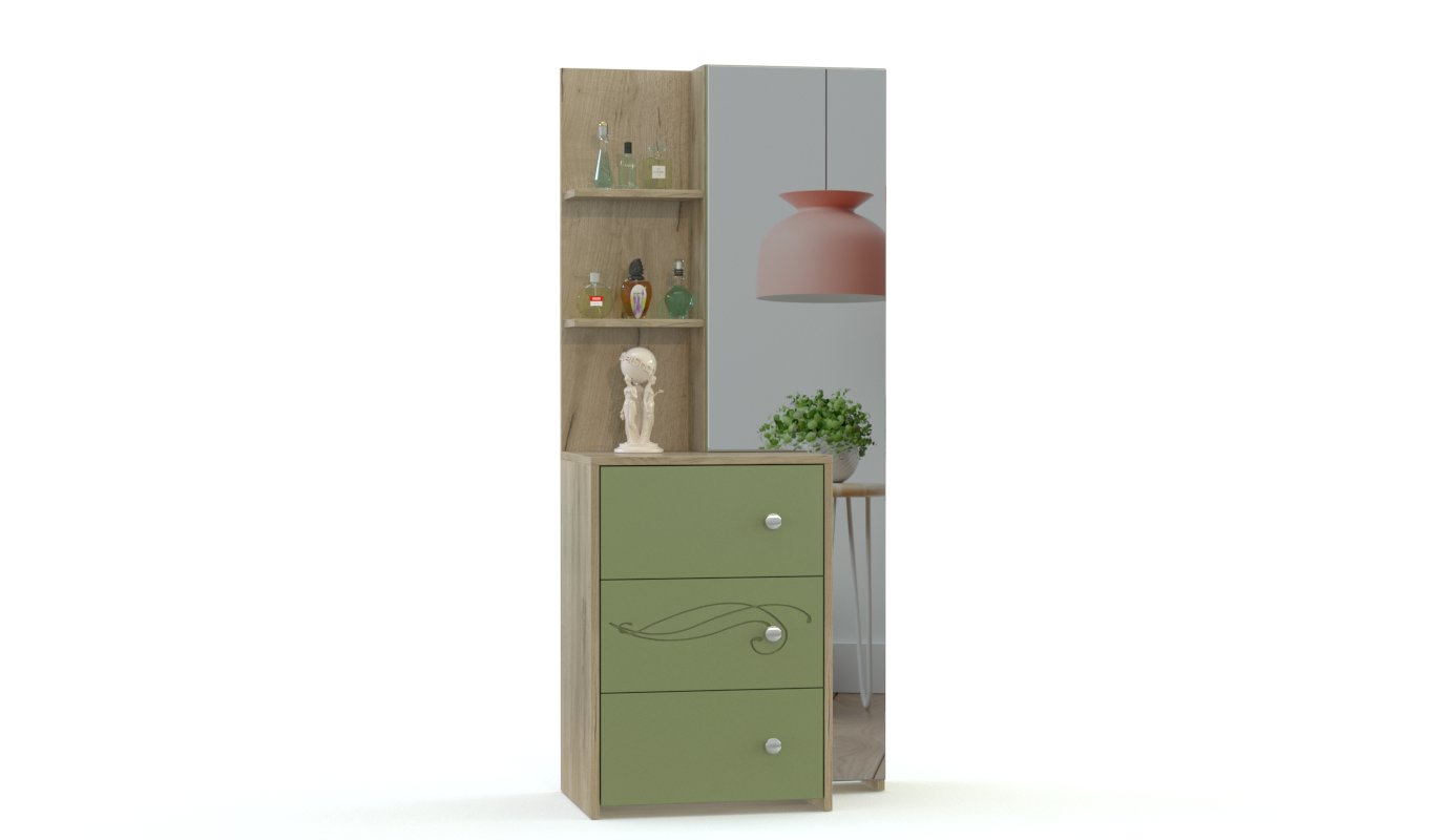 Современный модульный комплект совмещает функциональность, удобство компоновки отдельных элементов и эстетичный внешний вид. Помимо кровати с приставной тумбой и вместительного шкафа-купе с зеркальной дверью, в комплект входят два типа комодов – классический с выдвижными ящиками и совмещенный с зеркалом и открытыми полками. Интересны дизайнерские решения в отделке спальни Элика BMS – контрастная расцветка, изящные фигурные ручки и нанесенный на фасады рисунок.