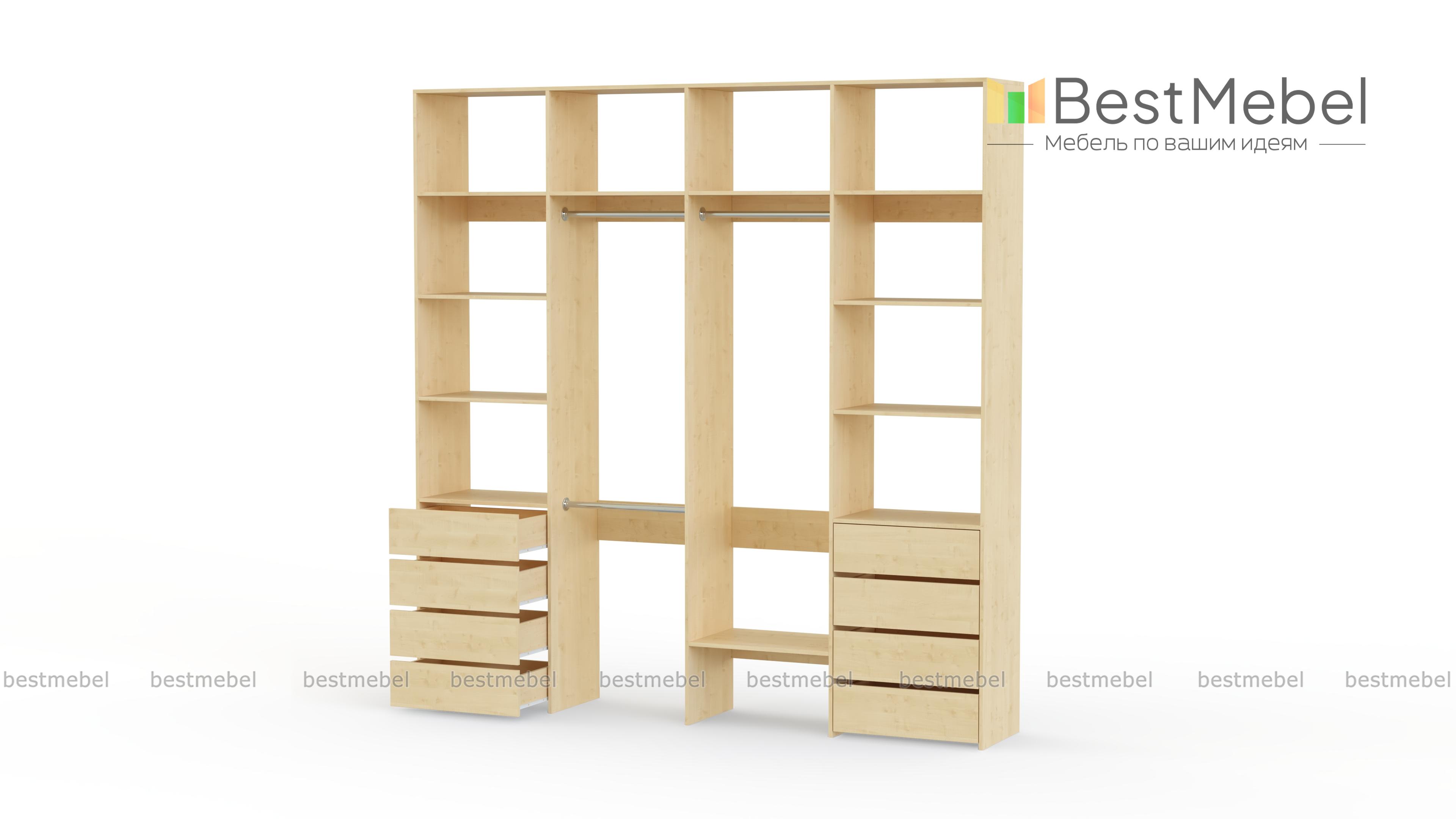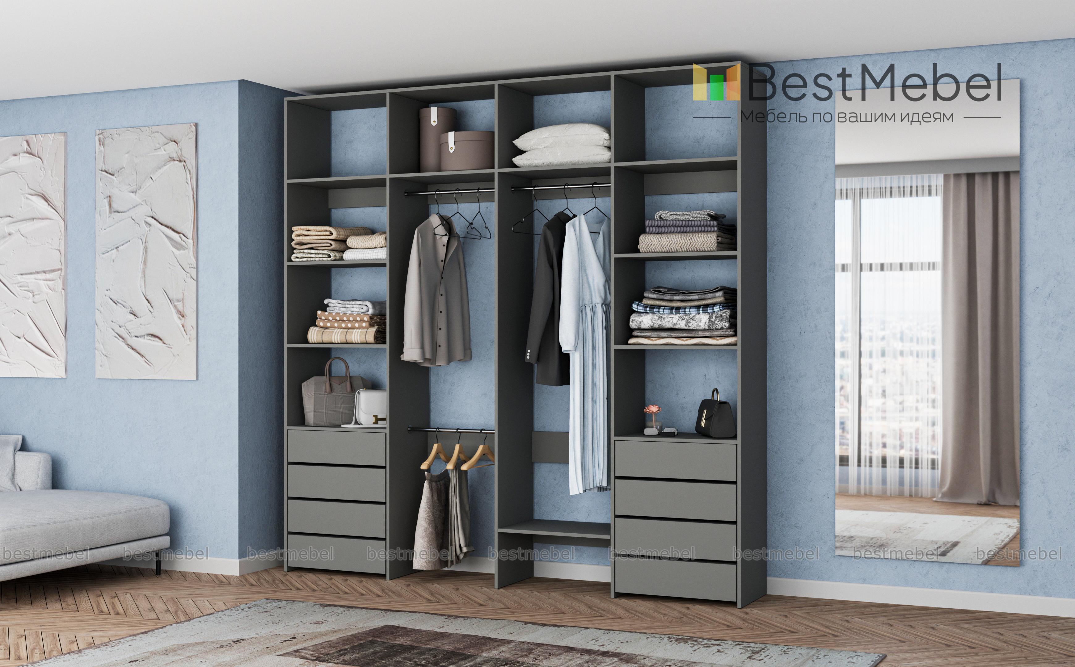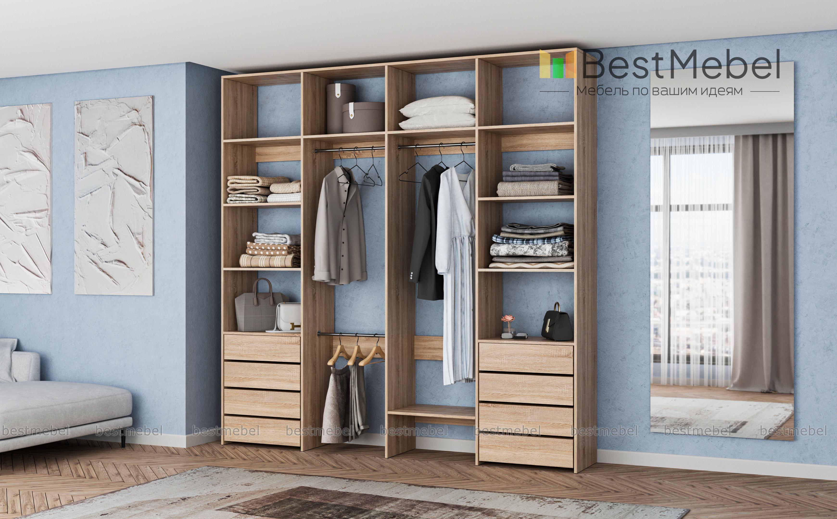 Стеллаж для одежды Мирта 21 BMS – удобный вариант для хранения одежды и обуви в гардеробной или прихожей. Два вместительных бельевых комода, платяные секции с тремя штангами и просторные открытые полки объединены в стильную конструкцию. Минимализм в отделке и базовый цвет позволяют легко комбинировать стеллаж из ламинированной ДСП с другой мебелью в доме. Купить стеллаж для одежды Мирта 21 BMS приглашаем в наш интернет-магазин с возможностью выбора цвета и габаритов.