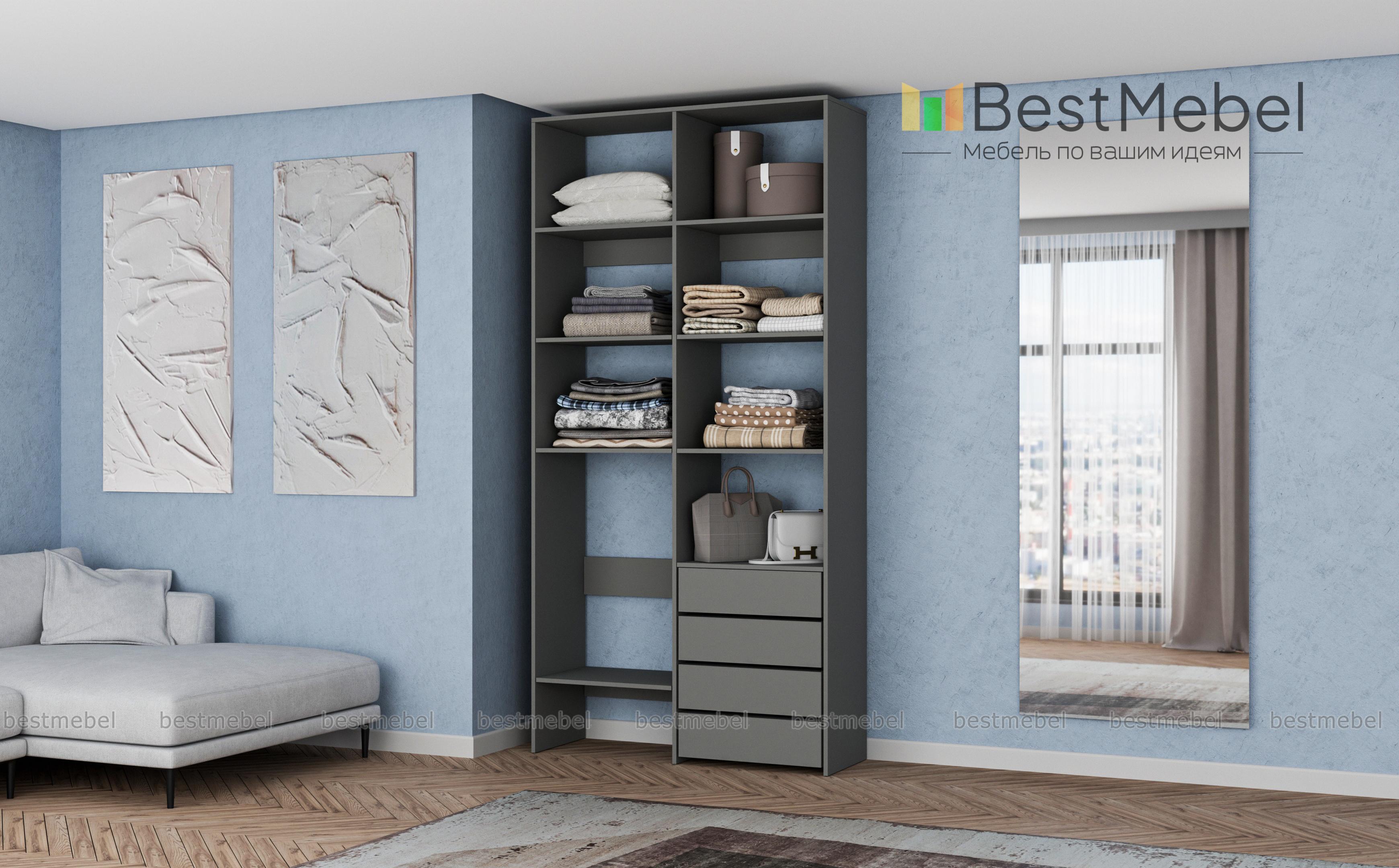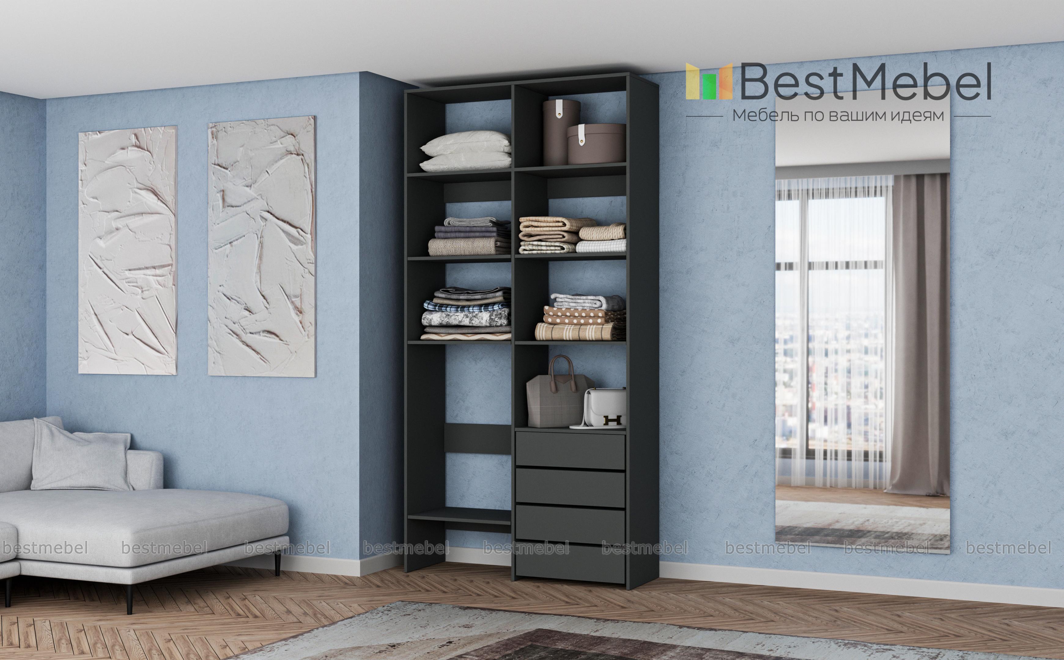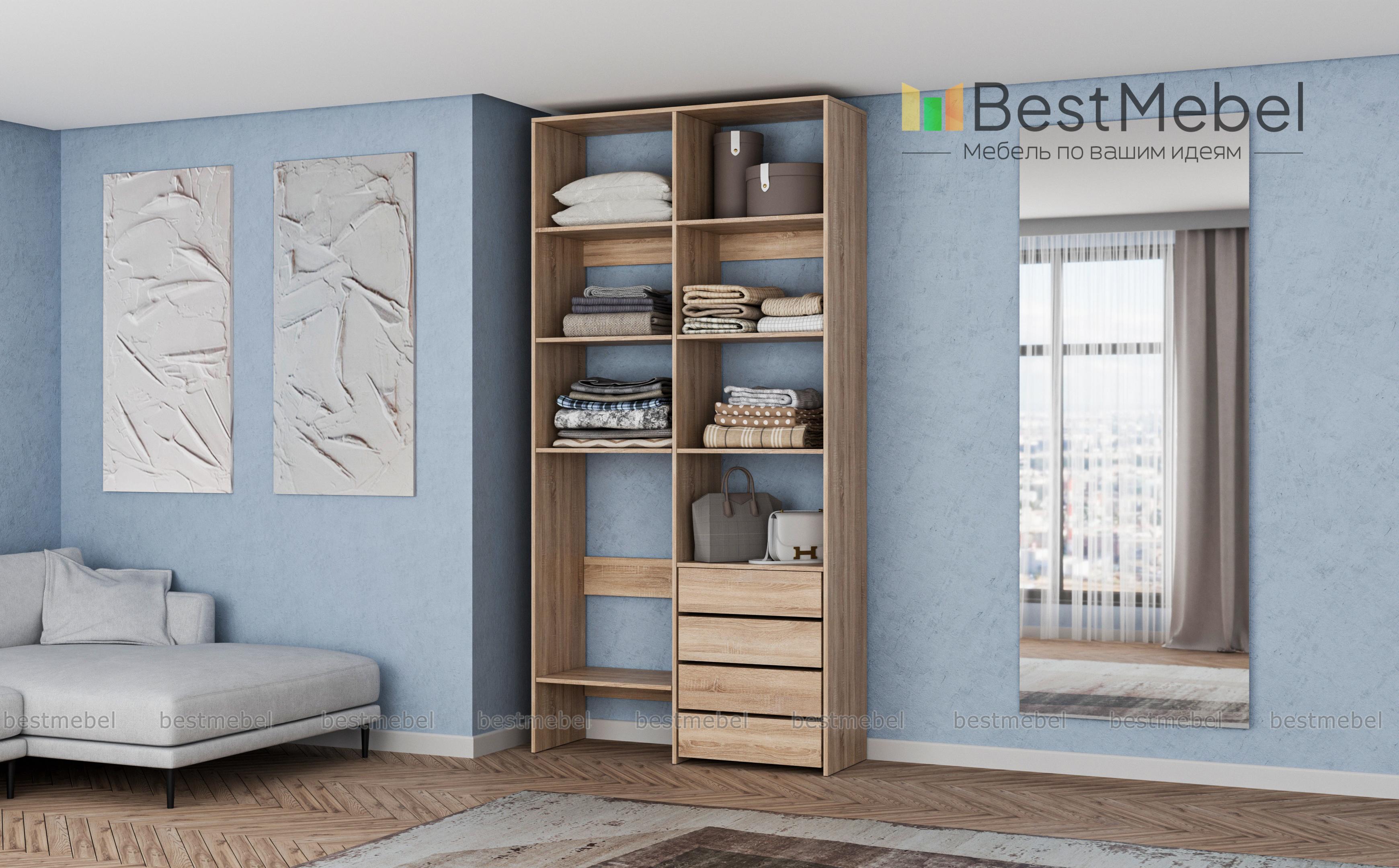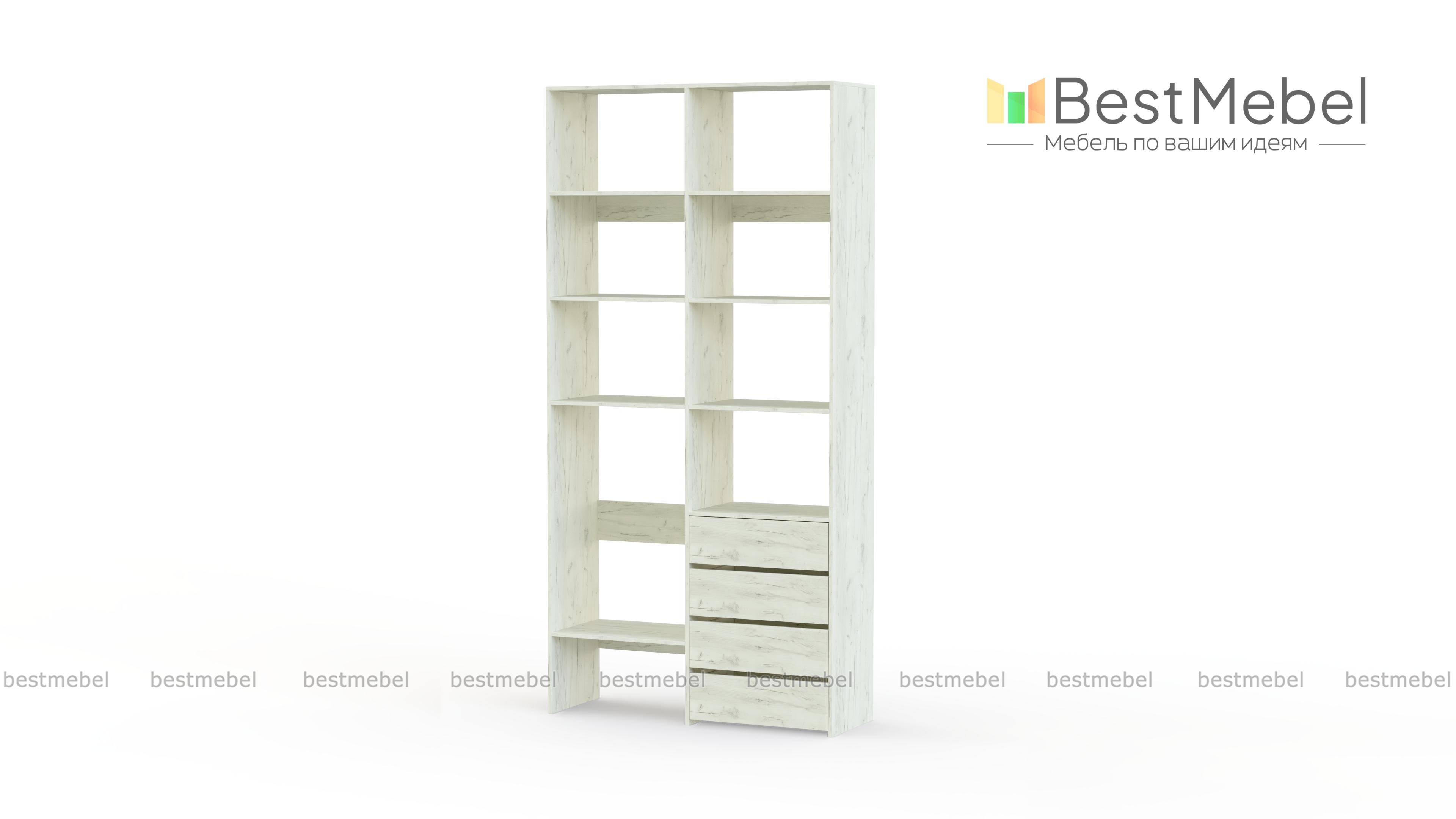 Стеллаж для одежды Мирта 4 BMS – практичное решение для гардеробной, детской комнаты или спальни. Лаконичный современный дизайн сочетается с надежной конструкцией из устойчивой к повреждениям ламинированной плиты. Открытые секции разной высоты помогут вам разместить как небольшие, так и габаритные вещи, а для мелочей предусмотрены четыре выдвижных ящика. Купить стеллаж для одежды Мирта 4 BMS приглашаем в наш интернет-магазин с выбором размеров и цвета по каталогу.