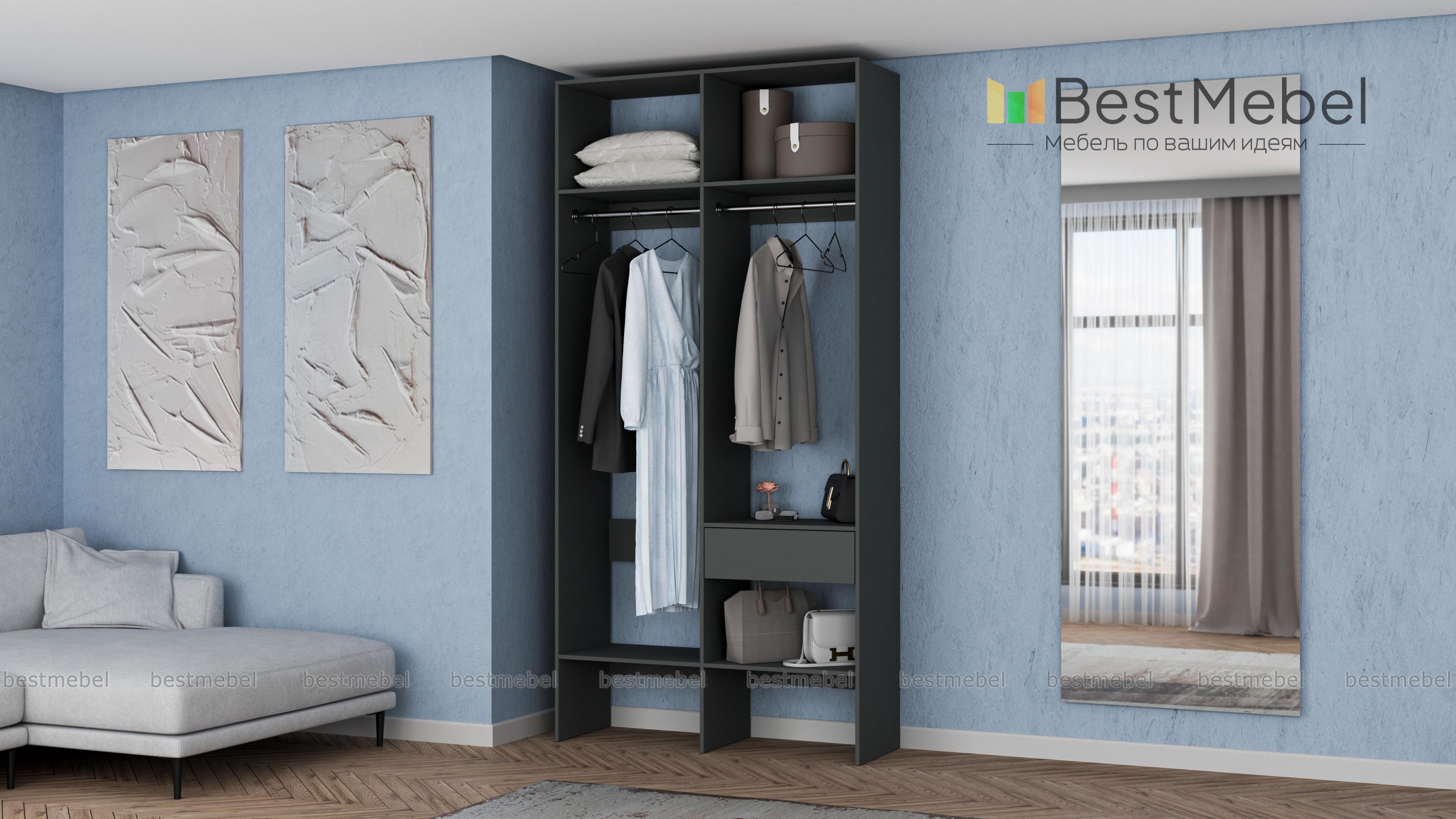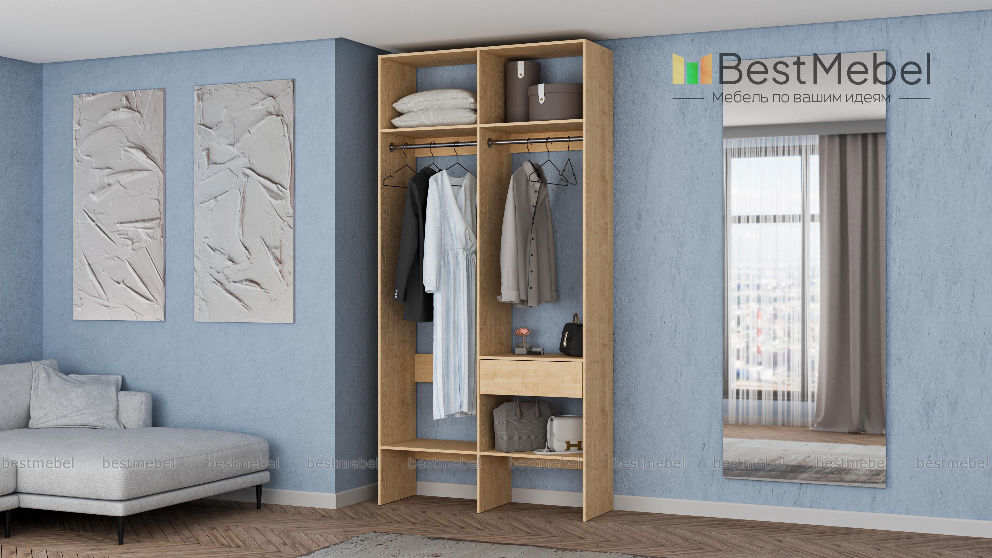 Стеллаж для одежды Мирта 42 BMS для гардеробной или прихожей выполнен в нейтральном светлом оттенке из ламинированной ДСП. Компактная и легкая двухсекционная конструкция объединила два платяных отделения разной высоты, верхние и нижние полки, а также выдвижной ящик, предназначенный для мелочей. В открытом стеллаже будут всегда на виду ваша повседневная одежда и обувь. Купить стеллаж для одежды Мирта 42 BMS вы сможете в нашем интернет-магазине, самостоятельно подобрав размеры и цвет.