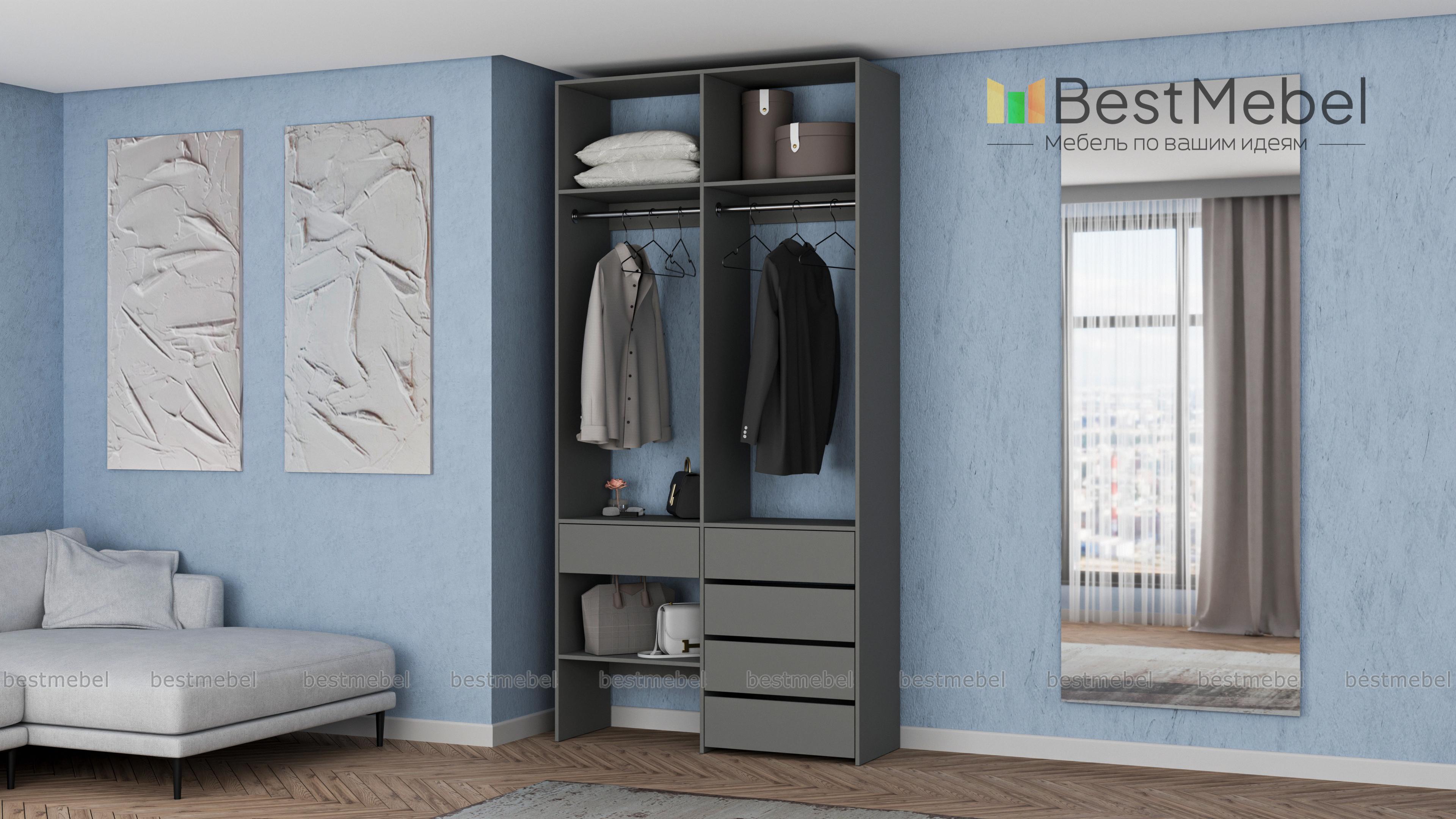 Стеллаж для одежды Мирта 46 BMS — стильный и функциональный, имеет удобную конфигурацию. Две штанги, полки на разной высоте и пять выдвижных ящиков максимально эффективно используют небольшое пространство. Двухсекционный стеллаж из прочной ламинированной ДСП прекрасно подходит для малогабаритных помещений, легко сохраняя порядок. Купить стеллаж для одежды Мирта 46 BMS в необходимом размере и любом оттенке из нашего каталога вы сможете на сайте интернет-магазина.