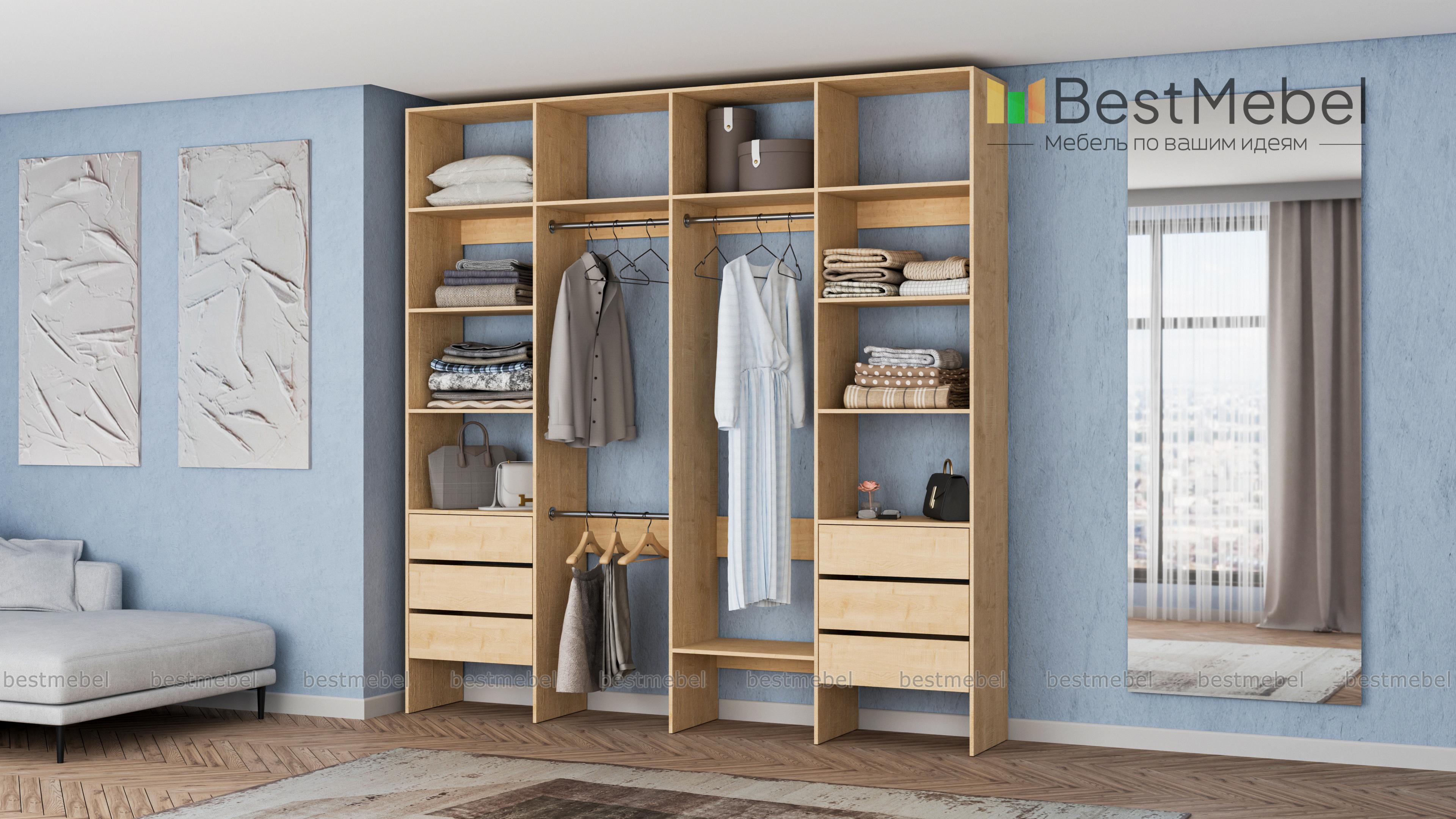 Стеллаж для одежды Мирта 65 BMS поможет легко сохранить порядок в гардеробной и входной зоне. Для компактного и аккуратного размещения вещей в стеллаже предусмотрены штанги, расположенные на двух уровнях, боковые и верхние полки, а также два ряда выдвижных ящиков. Качественная ламинированная ДСП гарантирует простоту ухода и долгий срок службы. Купить стеллаж для одежды Мирта 65 BMS, изготовленный по индивидуальным размерам, можно на сайте нашего интернет-магазина.
