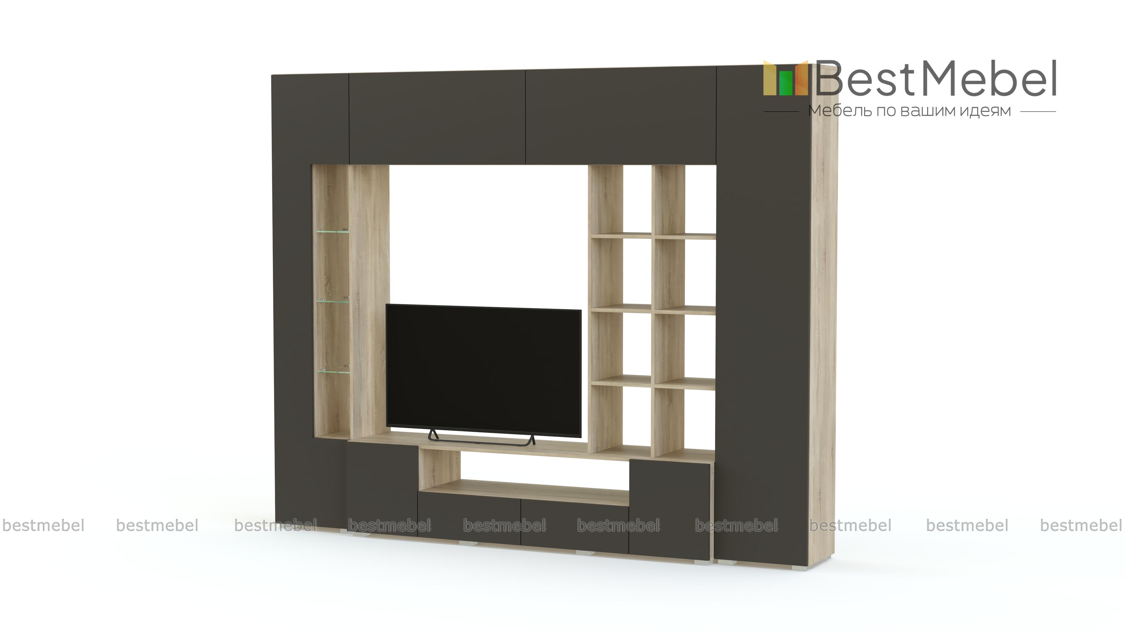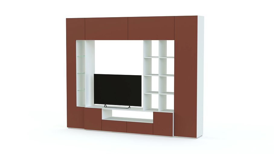 Стенка Денди № 1 BMS – яркая модель для современных гостиных в стиле минимализм и хай-тэк. Вместительный комплект состоит из отдельных модулей, образующих единую композицию. Стенка оборудована низкой напольной тумбой с нишей и распашными ящиками, застекленным пеналом, закрытым пеналом с полками и навесным шкафом с двумя секциями. Сплошные матовые фасады без ручек могут открываться легким нажатием. Купить стенку Денди № 1 BMS, подобрав необходимые параметры, вы сможете в нашем интернет-магазине.