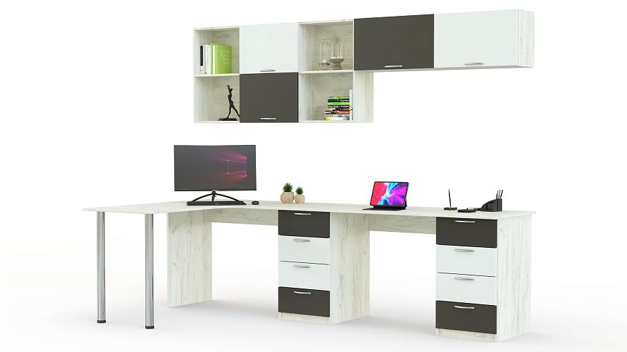 Угловой письменный стол для двоих Виктория 20 BMS имеет практичную Г-образную форму, позволяющую сэкономить пространство. Выполненная в сочетании светлых древесных тонов корпуса и контрастных фасадов, композиция гармонично впишется в интерьер детской. Для удобного хранения канцелярских мелочей, учебных материалов и принадлежностей для творчества предусмотрены две тумбы с выдвижными ящиками и навесная книжная полка. Купить угловой письменный стол для двоих Виктория 20 BMS вы всегда сможете в нашем интернет-магазине.
