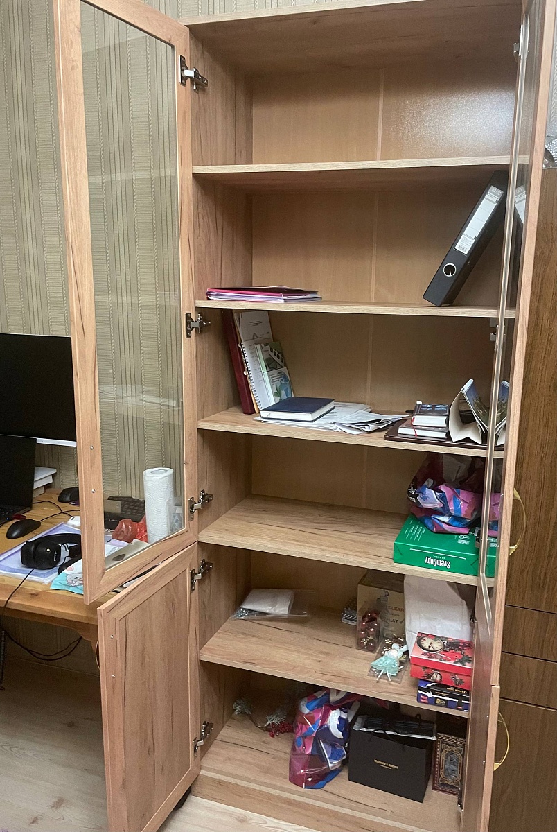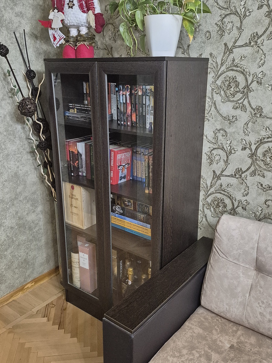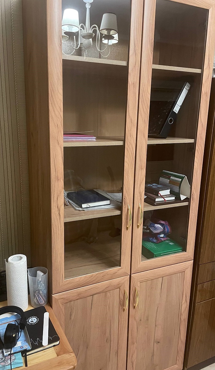 Хороший книжный шкаф. Сделали под мои размеры + выбрал дверцы с доводчиками и подрезку под плинтус, и еще ручки. Лучше собирать в конструкторе, чтобы не упустить детали изделия. Изготовление и доставка до Беларуси +/- 3 недели, собрать шкаф можно самому. Пару дней пах ДСП или краской, или еще чем-то таким, потом проветрился и сейчас все нормально. Заказ:№ 1229910.