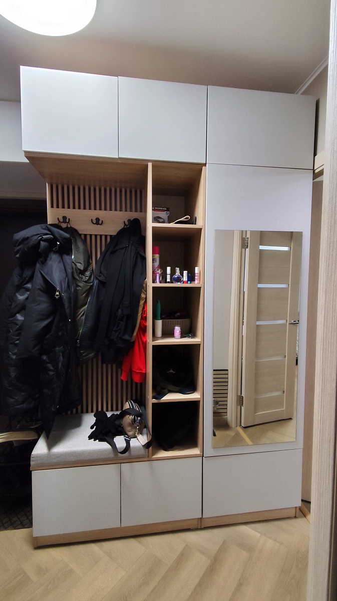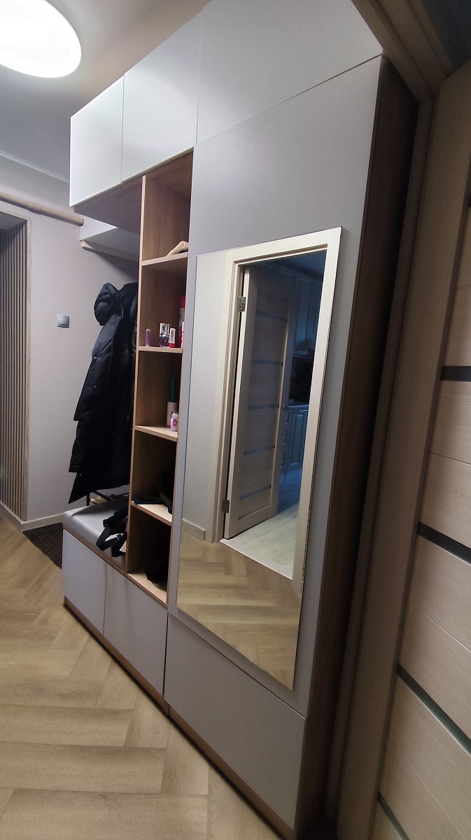 Заказ 00000101793, изделие ЭСКИЗ №00000101793 Прихожая Дублин 28 BMS (1500х2400х500)Отличный шкаф по индивидуальным размерам! Учтены все пожелания. Идеально вписался в коридор, вместительный и функциональный.  Качество ЛДСП хорошее. В эксплуатации почти год, нареканий нет. Эстетичный вид  за счёт отсутствия ручек. От открывания нажимом на шкафу не остаётся следов от пальцев.Доставка быстрая и удобная. Заказом довольны.