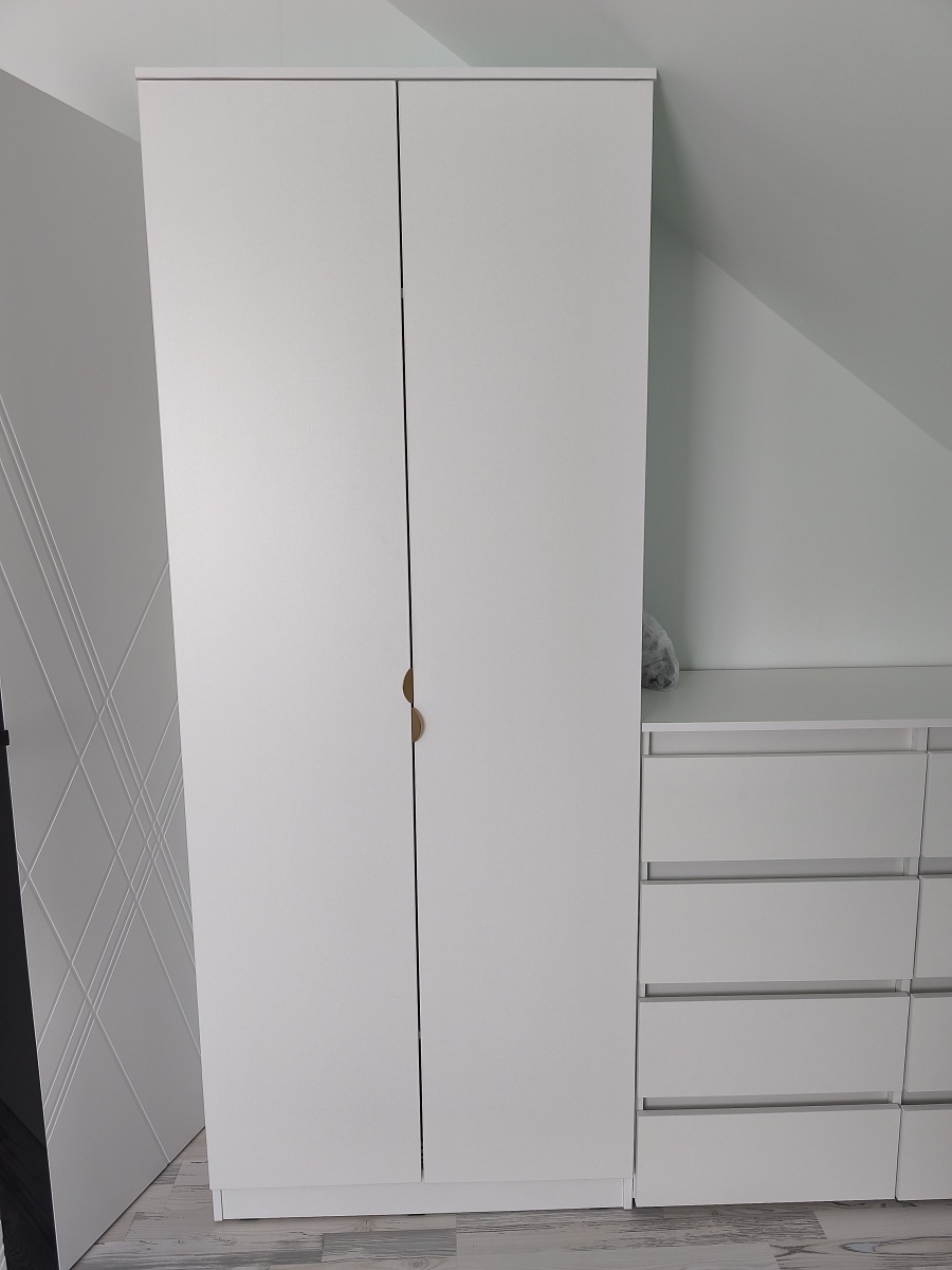 Шкаф красивый. Удобно, что можно заказать свой размер, выбрать комплектующие. Наша ошибка в выборе глубины шкафа: при расположении штанги в ширину и глубине 45 см "плечики" не умещаются. У нас крючок "плечиков" вращается, поэтому повесили чуть на искоса.