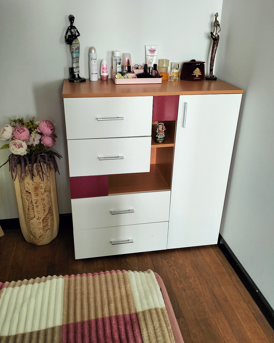 Комод понравился, заказывала в цвете бук бавария/белый глянец. Понятная схема сборки, все детали подписаны наклейками.