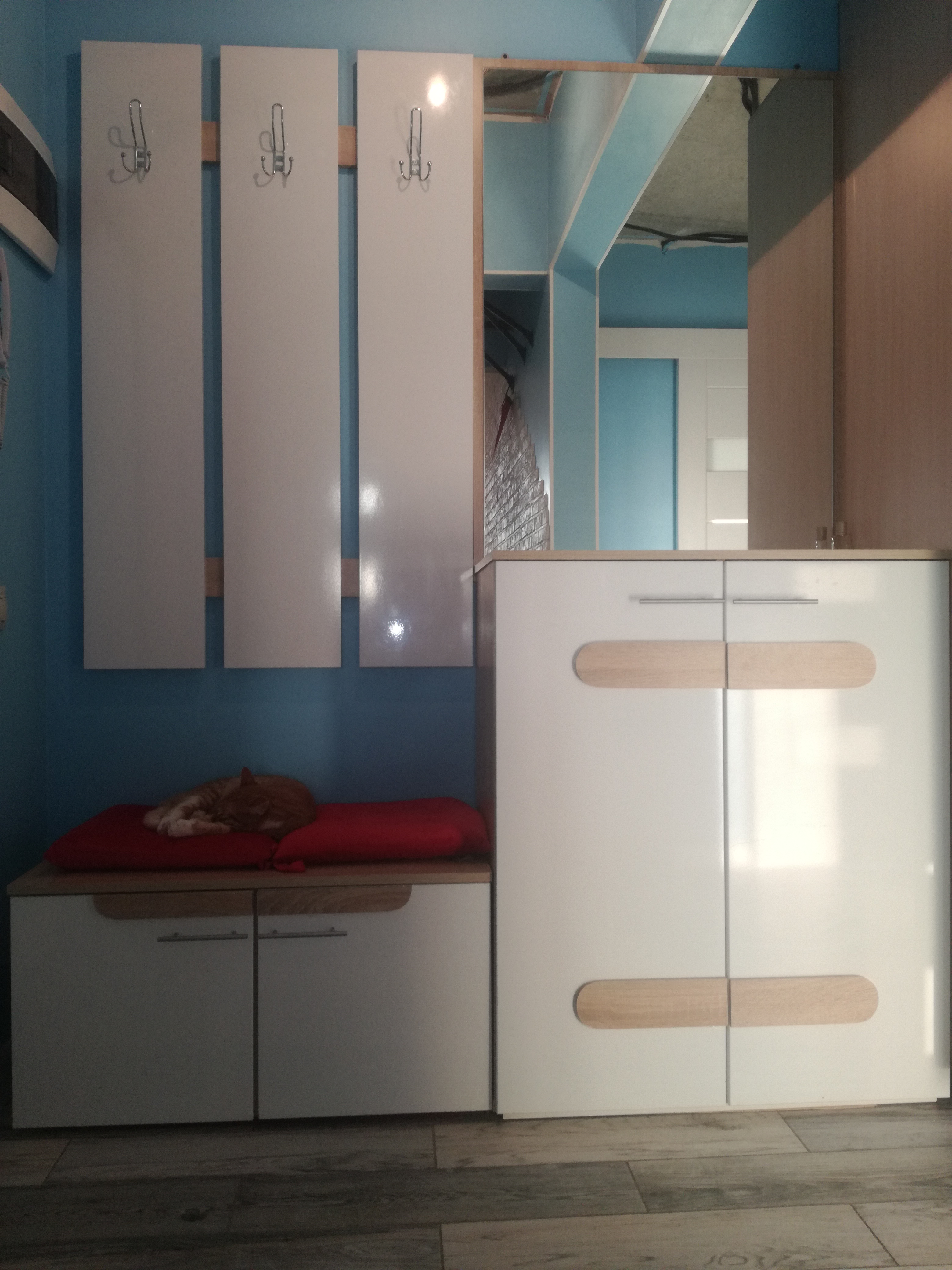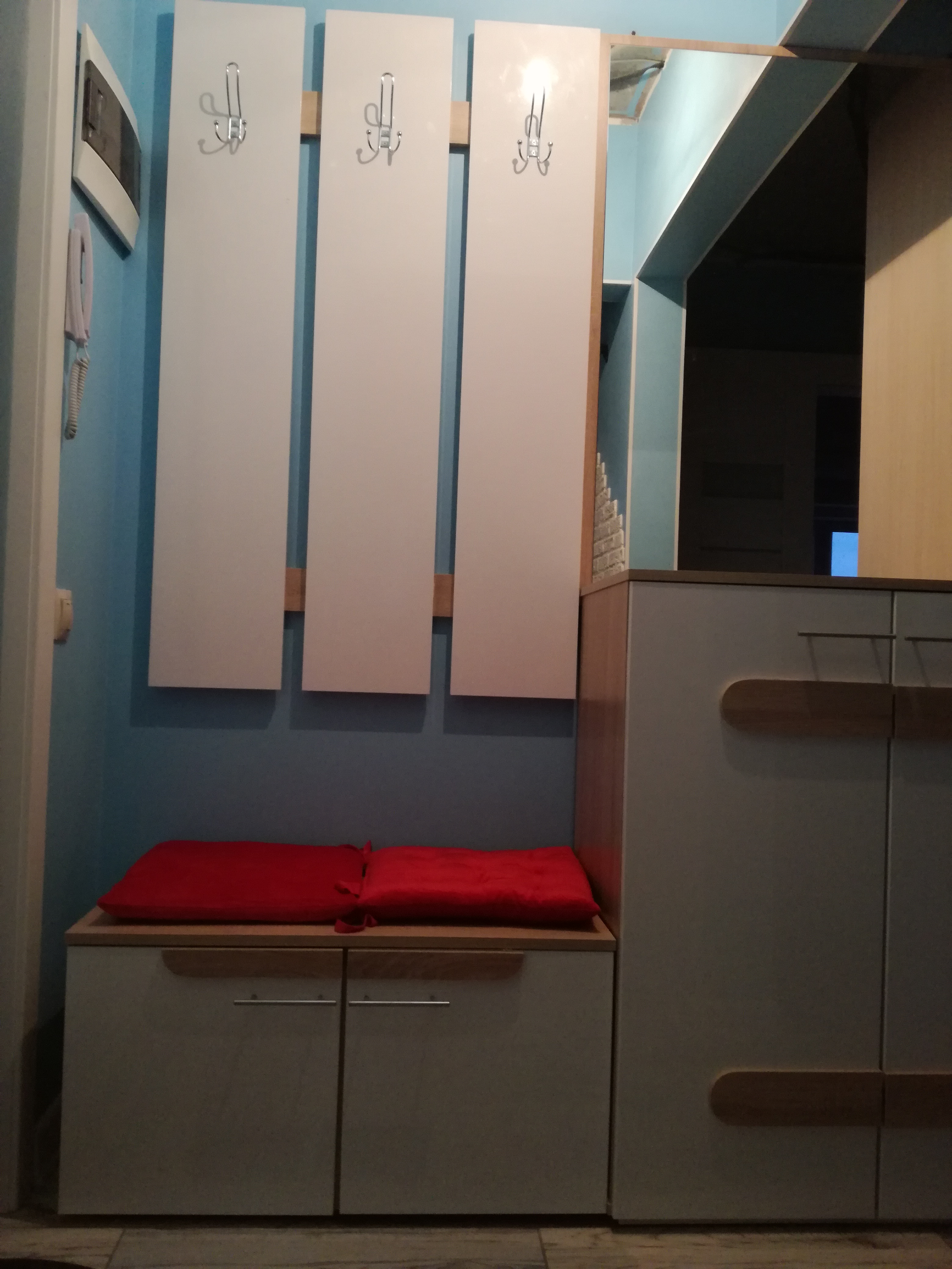 В наш узкий коридор было невозможно что-то подобрать. Оставался вариант просто повесить на стену крючки для одежды. Однако после долгих поисков нашли прихожую Александрия 4 BMS (глубина 24 см), которую произвели для нас по индивидуальным параметрам. Качество очень обрадовало, брака не было. При сборке все детали и отверстия аккуратно подходили друг к другу – мы ожидали, что будет хуже. За такую стоимость прихожую с необходимыми нам размерами у других производителей мы найти не смогли.